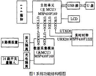 | 随着计算机科学技术的飞速发展和普及,数据采集技术已经渗透到雷达、通信、水声、遥感、地质勘探、振动工程、语音处理、智能仪器、工业自动控制以及生物医学工程等众多领域。 本设计借助于嵌入式系统设计技术和微处理器技术来实现的低功耗、大容量存储的便携式数据采集装置。该装置具有如下特点:多通道数据采集(包括8路模拟量采集通道)、16路开关量采集通道、海量数据实时显示存储、集成度高、携带方便。 嵌入式平台的构建 20世纪90年代后,嵌入式实时操作系统在嵌入式系统中确立了主导地位。典型产品如VxWorks、PSOS、VRTX、Nucleus、Lynx、WindowsCE、RTLinux、μCOS-II等等。 μCOS-II嵌入式操作系统简介 μCOS-II的特点如下:公开源代码,代码结构清晰、明了,注释详尽,组织有条理,可移植性好,可裁剪,可固化。内核属于抢占式,最多可以管理60个任务。是一个经实践证明好用且稳定可靠的内核,被成功地移植到了许多不同架构的处理器上。目前国内对μCOS-II的研究和应用都很多。 MSP430系列单片机介绍 MSP430系列单片机是美国德州仪器公司(TI)近几年开发的新一代16位单片机,MSP430F169是其中一款,具有强大的处理能力,RISC结构,125ns的指令周期,丰富的片内外设,内部具有2kB的RAM和60kB的FLASH,寻址空间达64k。 本设计中所用到的嵌入式处理器是TI公司的MSP430F169;操作系统是μCOS-II。 μCOS-II在MSP430F169上的移植 移植,指的是一个操作系统可以在某个微处理器或者微控制器上运行。虽然μCOS-II大部分源代码是用C语言写成的,但是仍然需要用汇编语言完成与处理器相关代码的编写。要使μCOS-II能正常移植到处理器,处理器必须满足以下要求:①处理器的C编译器能产生可重入代码;②能用C语言打开或关闭中断;③处理器支持中断,并且能够产生定时中断;④处理器能支持一定数量的数据存储硬件堆栈;⑤处理器有将堆栈指针和其他CPU寄存器存储和读出到堆栈(或者内存)的指令。 硬件设计 本数据采集装置的硬件设计主要分三个模块进行:主控单元、数据采集单元、实时时钟。主控单元主要完成了人机接口和存储电路的设计,其中存储电路选用USB接口电路作为数据存储,对采集数据及时可靠的存储保护,数据采集单元主要是模拟量、开关量输入通道设计。系统实时时钟是由MSP430F1222实现的,其与专用的RTC器件相比还具有可扩展性。 核心电路的设计