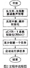 微处理器是整个电路的核心器件,其性能的优劣直接影响和决定着系统的功能指标。 晶振电路作为时基发生器的时钟振荡电路,为整个单片机芯片内部各个部分电路及单片机与其他数字系统或者计算机系统之间通信,提供可靠的同步时钟信号。MSP430F169单片机有3个时钟输入源:低速晶体振荡器(32k)、高速晶体振荡器(450k~8M)和DCO振荡器。无论系统上电或掉电都需要保证正常复位。复位电路本系统选用的CAT809微控制器监控电路符合要求。 电源设计 电源模块是数据采集系统硬件设计的重要组成部分,直接影响系统的精度和可靠性。输出质量高、稳压效果好、高效率和微功耗、可靠性强、微型化等是其设计原则。 数据存储电路 完成采集数据及时可靠的存储保护是本系统的一项重要功能,设计选用南京沁恒有限公司的纯粹USB接口CH375,它的主要特点是价格便宜、接口方便、可靠性高,尤其适用于产品的改型设计。 软件设计 主程序设计 主程序负责系统的初始化及任务的创建。基本流程如图2所示。主控单元的软件设计主要包括键盘扫描任务,液晶显示任务,数据存储任务、UART通信任务等。主要介绍数据存储任务和UART通信任务。 数据存储任务 采集数据及时可靠的存储保护是本采集装置的一项重要任务,U盘的读写方式下,仅仅是将U盘当作可移动的存储器,所以读写方法与读写闪存差不多,操作简单,速度快,只要几十条语句就可以读写数据。但计算机不能直接读取写入的数据。 Voidx Write CH375 Cmd(UINT8mCmd)向CH375写命令 { P2DIR=0x0F;设置P2口A0,CS,WR,RD为输出控制信号 P4OUT=mCmd;向CH375的并口输出数据 } Void xReadCH375 Data(void) 从CH375读数据 { UINT8mData; P4DIR=0;读操作所以数据输入 mData=P4IN;从CH375的并口输入数据 P2OUT=0x07; 输出无效的控制信号,完成操作CH375芯片,A0(P2.3)=0;CS(P2.2)=1;WR=(P2.1)=1;RD(P2.0)=1; return(mData); }