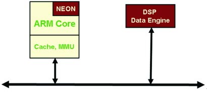 图 1 传统的双内核 DSP/RISC 处理架构 另一种方法是在单个设备中集成 DSP 与微处理器,我们可向 RISC 内核添加类似于 DSP 的指令(如乘法或累加指令)或向 DSP 内核添加类似的控制指令(如执行特定寻址任务的指令),从而实现上述目的。凭借相关工具的支持,这种“集成化”技术具有一定的优势,如在操作系统上仅运行唯一的原生应用,这样就能简化设计方案,便于集成,并加快产品上市进程。 在传统嵌入式应用中,分别采用通用微处理器(或微控制器)和DSP内核来执行通用功能与信号处理算法。上述方法的合理性在于: 系统应用分组的最大挑战在于,每个内核都需要自己的外部存储器子系统,这会增加功耗。除了控制独立存储器子系统所需的功耗之外,通常每个内核还要控制自己的一套外设,以实现处理内核数据的存取(如图1所示,DSP 及 ARM 与各自可能互不相同的一套外设及存储器子系统相连),这也会增加功耗,而且还会加大整体系统通信开销。 在 RISC 架构中集成 DSP 单元不仅能够实现更多并行操作,而且还更有效地共享资源(如外设及存储器等)。因此,采用速度更快的 RISC 架构,DSP算法的执行速度也相应地提高了。 不过,RISC 架构采用负载/存储原理,指令集的通用性较强,因此会对性能造成负面影响。有关设备的高速缓存技术比较复杂且大量使用管线处理,从而需要较高的时钟频率。基于 RISC 的微处理器添加增强型 DSP 功能与特性后,可支持乘法累加指令等 DSP 算法,也能支持图像或影像处理等专门单元。 由于带 RISC/DSP 双内核的处理器能够完成两个单核处理器的工作,因此不存在处理器间通信的问题。利用集成内核,我们可在 DSP 与控制器上动态进行代码分组,以适应系统要求或环境的变化。这种模式不仅能够加快环境转换,而且由于无需两套外设或存储器,因此进一步降低了资源占用。此外,这种方法还提高了系统的集成度,这不仅有助于降低功耗,而且还能通过在单个设备上集成更多功能而实现成本降低、性能提高及芯片尺寸缩减等其它多种优势。 如前所述,现代 DSP 处理器本身具备一些通用特性,如配置用于 DSP 运算的专用数据路径、以DSP 为中心的运算所需的专用指令集、满足多个时序存储器存取所需的多个存储体与总线,以及DSP 的专用外设等。 另一方面,通用处理器也在自身内核中集成了类似 DSP 的功能。我们可采用多种方法来为通用处理器添加 DSP 功能。设计人员可添加专用的单指令、多数据指令以及诸如多媒体扩展指令集 (MMX)指令等,也可为多个取操作数在现有 CPU内核(如瑞萨SH-DSP)上集成类似于定点 DSP 处理器的数据路径及其它相关资源。与ARM 公司的 NEON 架构类似,我们还可向 CPU 添加 DSP协处理器。设计人员也可创建三内核处理器等混合架构。 NEON SIMD 指令能并行处理 16 个元件,这加速了媒体及 DSP 应用。有关指令与内核密切配合(如图 2 所示),这种集成技术使我们能统一查看与 ARM 内核共享的存储器的情况,从而能使用统一的指令流,明确统一的平台目标,进而加速整体应用开发进程。