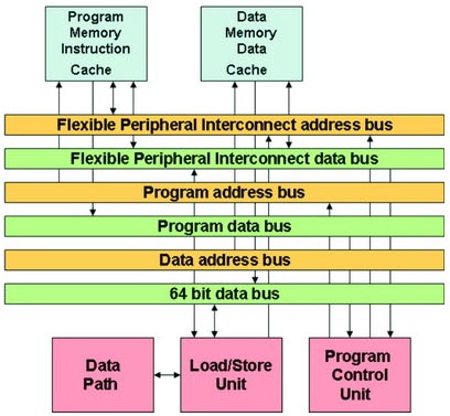 图 2 ARM NEON 架构 这种架构对 3G 手机等特定应用而言非常适用。就这种应用来说,DSP 数据引擎可用于视频编码等专门的处理工作,而集成了NEON DSP 功能的 ARM 内核则可用于音视频解码,RISC 处理引擎则可用于用户界面及协议栈处理等。 三内核架构(如图 3 所示)将类似于 MCU 的 RISC 负载/存储型架构与类似 DSP 的 Harvard 存储器架构结合在一起,地址总线均为 32 位宽。程序与数据存储器总线为 64 位宽。内核本身不包含任何存储器,不过可由设计人员定制。超标量架构包括 32 位定点数据通路、负载/存储单元及程序控制单元等。该设备每个循环能执行多达三个指令(数据通路指令、负载/存储指令以及指定回路的指令),这适合高性能DSP应用的需求。
