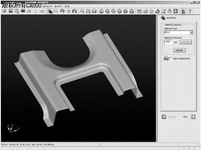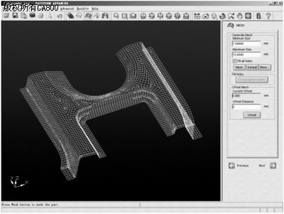 图2 选择正确的材料 Fastform有较好的几何修补工具,可对于读入的CAD模型进行编辑,成为分析所需要的模型。 Fastform的自动网格划分功能不需要工程师具备有限元分析的经验即可使用,自动划分的网格符合钣金塑性成形工艺的特点。同时,它的高级功能容许工程师对网格进行修复,只需设置网格的最大尺寸和最小尺寸,即可在1分钟之内完成网格划分,如图3所示。