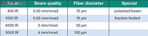 随着高亮度激光的最新发展,在许多全新的领域中,激光材料加工应用的机会不断增加。我们以技术非常成熟的宝石棒结构固体激光器为例,其相关的两个完全不同的发展方向值得关注。一方面,宝石棒的将其直径扩大,而长度减少为几百个微米,这就成就了盘式激光器。另一方面,将棒的长度加大,直径减小,这就成为光纤激光。 谈到光纤激光,光纤的长度保证了光束质量接近衍射极限(在给定波长的激光中,理论极限,或最小可能的聚焦尺寸)。这种激光的谐振腔无须进行任何调整,光束质量是被光纤的物理特性所规范。光纤激光除了以上的两大优势之外,还应当了解,其泵浦能量可以通过传输光纤进行耦合,传输至有源光纤或受激光纤,从而免去了二极管泵浦源到光纤激光的光学调整的繁琐的过程。 图 1 指出不同工业激光的光束质量参数(BPP) 与输出功率的关系。其中BPP 值越小表明光束质量越好。与其它激光相比,光纤激光表现出更好的光束质量(只有在5千到一万瓦范围内略逊于二氧化碳激光器)。在Fraunhofer 我们一致认为,光纤激光具有更为广阔的未来。 在德国的Dresden, Fraunhofer IWS 以及在美国密执根的Plymouth的IWS 分支机构中我们拥有以下表格中的各种光纤激光可以用于工业加工发展的研究。 这些光纤激光具备以下特点:体积非常小,在泵浦源与最终的光学聚焦系统之间没有任何需要进行准之调节的零件,无须进行任何调整,很高的电光转换效率 (25-30 %)。此外,光纤激光具有非常优秀的光束质量和超长的泵浦源寿命(超过5万小时)。我们可以使用很小的扩束准直系统,进而可以使用尺寸很小的振镜系统进行高速光束操控。 15微米直径的光纤长度限制在数米范围内,因为存在拉曼散射效应, 它将在使用较长的光纤传输时减少输出能量。而50微米的光纤限制在15米长度以内, 100和200微米的光纤长度没有限制!