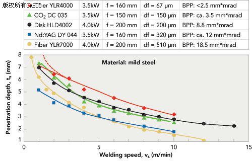 由于极高的光束质量,我们可以使用非常紧凑、小巧的聚焦和扫描光学系统,而无须改变焊接参数, 同时适用于远场技术。在这两种情况下, 激光优秀的光束质量会生成特定的焊接等离子体,(与Nd:YAG 和盘式激光相比),一定要使用保护气体,否则会发生吸收和主体散射效应。 图3 显示光纤、盘式、Nd:YAG和CO2 激光系统的焊接速度对应与深度的试测数据。由于我们有限的CO2激光的能量范围,我们仅就3.5千瓦的CO2激光进行了对比试验。盘式激光的焊接数据有些偏离,因为我们使用的是4kW 输出功率的TRUMPF’s HLD4002 盘式激光。同样,我们使用了其它光纤激光的数据,BIAS Bremen 的4.0kW YLR7000 光纤激光 (300 微米光纤)。总之,以下数据表明并非不同的激光会造成不同的焊接结果,而是不同的光束质量。正如两种不同光束质量,其它参数极为接近的光纤激光,试验结果却截然不同。
