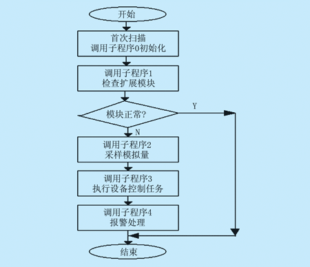 图4 主程序框图 6 系统软件设计 6.1 PLC程序设计 主程序框图如图4所示,其中子程序0为初始化程序,子程序1为检查扩展模块是否正常,子程序2为模拟量采样子程序,子程序3为对各执行设备输出的采样,子程序4为对各被控量和执行设备异常的报警子程序。由于篇幅所限,各子程序框图在此从略。