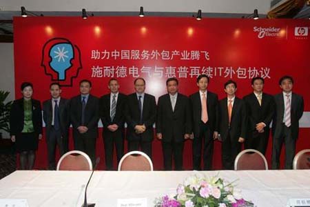 | 2007年12月11日,北京 ――施耐德电气(中国)与中国惠普有限公司(HP)在京共同签署了为期三年的IT外包协议。这是继2004年10月惠普与施耐德电气签订首个长期战略外包服务合同后,双方的合作进入第四年。施耐德电气(中国)投资有限公司总裁杜华君、中国惠普有限公司总裁符标榜作为双方代表出席了此次签约仪式。