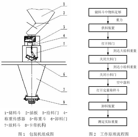 | 1.引言 随着机械自动化水平的不断提高,自动控制技术在定量包装生产中应用越来越多,在粮食、化肥、饲料和轻工等行业中都有广泛应用。称量包装技术的发展大致经历了手工称量、继电器控制、称重仪表控制、PLC 控制等几个阶段。相对于传统的称重仪表控制,应用PLC 和触摸屏组成的控制系统便于将开关量设置、复位操作以及设定和修改系统参数功能有机的结合,提高机器速度和精度。 2. 包装机的工作原理 2.1 包装机的组成 称重式自动定量包装机由供料部分、称重部分与卸料部分组成。供料部分分为储料斗和重力供料装置。储料斗用于存储需要灌装的物料,重力供料装置主要是向称量料斗中提供物料。称重部分即称量斗,它通过和称重传感器相连,测量物料重量。卸料部分用来完成标准重量物料的卸料装袋过程。如图1 所示,为包装机的组成图。 2.2 工作原理 称重式自动定量包装机的工作原理流程图如图2 所示。当储料斗中物料足够,在重力的作用下进入重力供料装置,完全打开料门进入大给料状态。当到达给定大给料重量时,关闭给料门,留一条狭缝,进入小给料状态。当到达给定小给料重量时,完全关闭给料门,经过一定的空中落料,称量斗稳定,并且卡袋机构卡紧时,卸料门打开,物料进入放料斗,再落入袋内,完成一个包装循环。 ![]() |
