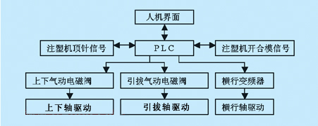 | 目前,市场上流行的注塑机专用机械手就控制系统而言都是使用专用的微处理机加接口组成的最小控制系统。在机械构造方面,当定位精度要求不高时采用时规皮带传动,行走部分配置滑线导轨,由变频调速器调速控制。本文提出一种基于PLC控制的注塑机专用机械手,充分利用PLC灵活控制的特点,行走部分配置滑线导轨,采用斜齿轮齿条传动和变频调速控制;是一种高性价比的机电一体化设备。文章分别从机械构造和电气控制两个层面对该机作了较为完整的论述。 1 引言 在塑胶制品中,以制品的加工方法不同来分类,主要可以分为四大类。一为注塑成型产品;二为吹塑成型产品;三为挤出成型产品;四为压延成型产品。其中应用面最广、品种最多、精密度最高的,当数注塑成品产品类,小到日常生活用品中的锅瓢碗盏、儿童玩具,大到精密工业设备上的零部件,随着各种高分子新材料的不断涌现,许多金属零部件亦有不断被这些新材料逐步取代的趋势。为配合注塑成型产品自动化生产要求,为保证制品的高品质高效率,必须尽量减少人工的干预,基于上述思想,许多注塑机生产厂家将注塑机专用机械手的装置列入了客户辅助选用件的范围。 然而,对于原有注射机而言,绝大多数都没有此项装置,因此,开发适合注塑机使用的专用辅助机械手,就成了提升厂家产品的竞争力的一种重要手段和必然选择。