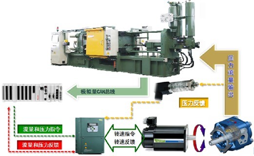 如上图:使用电液伺服系统后,伺服驱动器与伺服马达一起,对压铸机的压