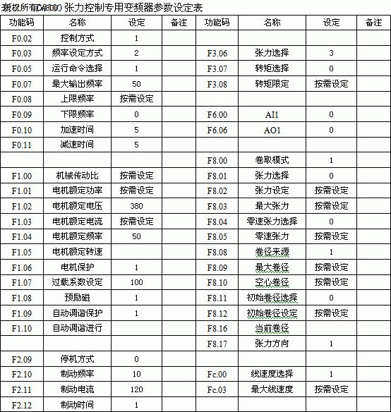 五、TD3300张力控制专用变频器的设定:(参见—变频器的用户手册) TD3300张力控制专用变频器是力矩电机、直流电机等卷曲类控制理想的替代产品。它优点是:控制简洁、易于维护、造价低等,具有较高的性能价格比。 具体的参数设定如下表(仅供参考):  表2 TD3300张力控制专用变频器参数设定表