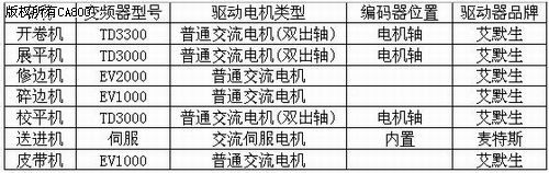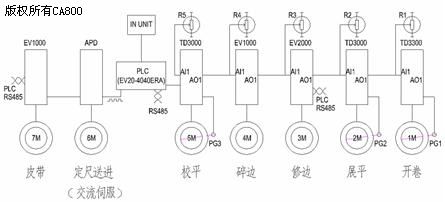 三、电气控制方案: 展平、修边、碎边和校平的运行速度容易实现同步,只要将电机的旋转速度按照自身的减速器、传动辊子等的机械参数折算成线速度,与生产线的线速度V1统一即可。 在开卷工作中,由于卷径是在不断变化的,开卷电机的旋转速度与生产线的线速度V1很难找到匹配关系。换句话说,如何解决开卷机与整条生产线的运行速度V1同步的问题,是电气设计的主要工作之一。 定尺送进、横剪刀和皮带是断续运行。板材由定尺送进机的牵引辊按照加工要求的长度送入剪扳机进行横向剪切。因此,定尺送进机是生产线的位置控制精度要求最高的设备。 目前,开卷机的控制有以下几种方案: ①、电磁滑差调速:手动调节开卷机的转速,使之与生产线的线速度一致。 ②、张力控制:利用板材表面张力恒定的原理,使之自动跟随生产线的线速度。 张力控制的实施又分为:力矩电机、直流电机、张力控制器等。 方案①的优点:电气控制简单,造价低廉。缺点:控制方式陈旧,劳动量大,效率低,耗能高,无法实现生产线的自动运行。 方案②的优点:操作简单,自动化程度高。缺点:控制复杂,造价高昂。 我们经过调研,决定采用艾默生TD3300张力控制交流变频器,使开卷机在张力的控制下,自动跟随生产线的线速度。在自动化程度不降低的前提下,大大降低了开卷生产线的制造成本,提高了性能价格比。 由于生产线要求的几何精度较高,所以,我们采用了交流伺服电机作为定尺送进机的拖动。在几何精度要求不高的开卷横剪线上,也可采用(编码器+交流电机)的控制方式驱动定尺送进机,这样的电气系统更简单、经济。