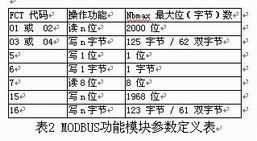 图6 AC500 程序图 只需设定好MODBUS功能块的(COM,SLAVE,FCT,ADDR,NB等)参数,PLC主站就可以顺利的从1#I/O子站读取数据。其中FCT,NB的参数可根据实际情况依照表2确定 。