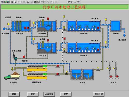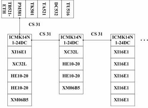上一级PLC主站的控制命令。 监控组态设计及与PLC主站的通讯 由于污水处理控制对象多且分散,生产工艺流程复杂,如果采用集中控制方式,则需要使用大量导线,在长距离传输过程中非常容易受到干扰,所以本系统采用分布式集散控制系统,将管理与控制分离。计算机选用HP工业PC机,预装北京昆仑通态公司的MCGS 5.5通用版。MCGS监控组态设计包含监控界面设计,定义数据变量,组态设计,动画等方面。用MCGS提供的基本绘图工具与元件库创建图形块并进行组态设计,污水处理系统工艺流程组态画面(如图4):  图4 污水处理工艺流程组态图 鼓风机,水泵,运行阀的工作状态可以通过动画实时显示;污水,污泥,药水,空气的流动方向及流量表的数据也能根据现场的情况随时更新。操作人员在登陆并输入用户名和密码后,可任意调入各局部工艺图、运行表、设定表和控制表,工艺图以图形的方式显示各个工段的工艺流程和数据,并能根据控制的需要直接设定现场的相应参数(例如,泵站的变频器的恒定水位,报警水位,停泵水位的设定,排泥时间的设定等)。此外,系统还可以提供故障报警查询,工作报表生成等功能。MCGS中的实时数据库是监控系统的核心,而数据变量是构成实时数据库的基本单元。将用户界面中的图形对象与实时数据库中的数据变量建立联系,现场的运行情况就可以通过动画实时的显示在监控界面上了。 工控计算机只需一块普通的网卡就可以通过Ethernet LAN接收到来自PLC主站的数据。PLC主站由1台AC500系列PLC及相应的外围设备组成,置于中央控制室。PLC主站从分布I/O接收数据,进行相关的处理与控制,同时通过标准工业以太网TCP/IP通讯模块(TB521-ETH)传输给工控计算机,传输速率为10Mbit/s ,介质为屏蔽双绞线。 PLC主站与分布I/O的通信 PLC主站与分布I/O的通讯网络框图,如图5所示:  图5 CS31通讯网络图