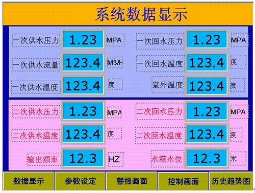 (2)参数设定画面说明。可以设定二次供水温度,3位加一位小数;二次供水压力,1位加2位小数,单位MPA;同时可以设置温度和压力的高限和低限。