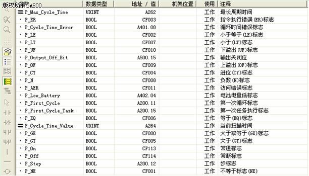 | 速棉精梳机时,由于设备的自动控制功能比前三代产品都大大增加,系统中包含了模拟量控制、函数运算、Modbus通讯、数据高速采集等,如果没有CP1H,我们只能选用中型PLC才能满足控制方案的要求。经综合考虑,我们还是选择了欧姆龙的CP1H小型机。 4. 1. 整体方案 通过欧姆龙的小型机CP1H可编程控器、日本Pro-face的触摸屏、德国KEB变频器等强强联合,组成了公司“第四代”CJ60型棉精梳机的控制方案,其核心技术是分别采用RS232接口和Modbus通讯方式连接PLC与触摸屏及变频器、运用PLC的内置模拟量输入功能直接连接8个模拟量传感器,实现对设备关键部位自停的智能化、数字化的控制、设备历史故障发生与解除时间及次数的记忆、多级密码分层管理等,并可通过触摸屏的以太网接口实现向上通讯的功能,为纺织厂的现代化管理提供必要的保证。 对于PLC的软件编程,根据需要将不同功能的程序段分列,每个任务分别用最合适的编程语言如梯形图、高级语言等来完成。 4. 2. I/O配置、标志位、变量声明 通过I/O配置、标志位、变量声明表,可方便灵活地查到各个I/O点位、标志、变量等的类型、地址、功能注释等,部分声明如下: