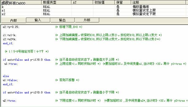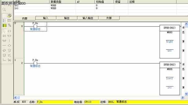 图2 梯形图 T型图的结构给程序设计中的逻辑判断和分支操作提供了极大的方便。 Cx-One软件的特点之一,是可在程序段下方同页显示某变量的地址拦,方便观察和调试等。 4.4. ST语言的应用 ST语言用在具有多个循环和具有函数运算的控制程序中尤其方便,诸如此类的编程方法一般在中型PLC机中才具有,但CP1H型小型机也具备了,很有特色。在CJ60的整机控制系统中除了逻辑量的控制之外,其他的控制则是运用了灵活的ST语言来实现,例如对于功能相同的N个传感器的信号读入和处理等,使用该语言编制控制程序,取得了很好的效果。节选如下:(见图3)