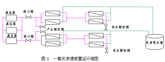 压差达到一定数值则超滤装置也进行反洗。现在的超滤反洗一般采用定时反洗。 5.3反渗透装置的控制 反渗透工艺是一种在压力驱动下,借助半透膜的选择截留作用,将溶液中的溶质与溶剂分闪的分离方法。在水处理工艺运用中,将水中无机离子、细菌、病毒、有机物及胶质等杂质去除,以获得高质量的水。系统对反渗透装置的控制有三种工作状态:运行、备用、冲洗。反渗透装置有3个由电磁阀控制的阀门,反洗进口阀、产水排放阀、浓水排放自动阀。反渗透装置运行简图见图8:
