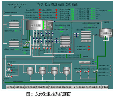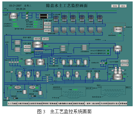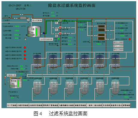 | 1 引言 除盐水站作为莱钢银山型钢公司25MW发电工程的主要设施,担负着供应三台130t锅炉和四台150t除氧器用水的重要任务。从现场除盐水生产来看,自动化监控程度低,绝大部分的水泵是人工操作控制,在新的改造项目中需要在原先生产工艺上增加多介质、活性炭过滤器以及阴阳离子置换器等高新技术生产设备,所以更加需要对整个除盐水站进行自动化控制的改造,从而可以节约能源,降低工人劳动强度,大大提高生产水平。 2除盐水生产工艺简介 除盐水改造后的生产线主要设备有6个多介质和6个活性炭过滤器,超滤装置,反渗透装置,脱碳风机,阴离子和阳离子交换器,以及生水泵3台(1台变频),高压泵6台,4台除盐水泵(1台变频),反渗透出水泵3台(1台变频)等。生产工艺图见图1: ![]() 3 系统组成及软件设计 根据工艺的要求,莱钢银山型钢公司25MW发电工程除盐水站PLC控制系统采用一套西门子的SIMATIC的S7-4007-400挂ET200结构,由一个主站、三个从站和两个PC站(上位机)组成。用S7-400系列模块做主站,S7-300系列模块作从站,主站通过PROFIBUS总线电缆和接口模块与从站通讯,这样的构架既保证了PLC系统的先进性又为用户节省了成本。主站是由一个支持冗余的底板和S7-400系列电源模块、CPU模块、CP模块组成,模块支持热插拔。从站是ET200M分布式系统,是在工业现场经常使用的PROFIBUS DP现场总线上的从站,用于连接工业控制系统中的各种现场装置。 3.1 硬件配置 本系统是建立在S7-400控制器、DELL 的Pentium工控机平台之上的分布式系统。S7-400是模块化PLC系统,采用标准的以太网通讯,每个控制器可以控制64个回路,最大的可处理131072个I/O点,其中模拟量I/O点数为168个,逻辑扫描率为1.25MB/S。S7-400与上位机采用工业以太网,通讯速率为100Mbps。系统主要硬件配置和I/O点数统计见表1和表2,系统配置结构见图2: ![]() ![]() ![]() 除盐水生产线自动化控制系统设计由两级网络组成,一级是过程控制级,二级是基础控制级。 第一级——过程控制。以S7-400PLC系统作为主要控制核心,由两台上位机、PLC控制单元加以太网卡等组成工业以太网,监控站利用组态软件WinCC实现对工作现场进行监督控制,中央处理器采用CPU416,I/O系统采用ET200M,通过ET200分布I/O通讯对流量、液位、pH值、出口压力等参数进行采集,上位机将实时数据库的数据送到服务器的关系数据库中,进行保存和数据处理。过程控制级通过工业以太网将上位机系统和现场监测与控制点紧密的结合为一个整体,从而实现对整个控制系统的计算机在线远程诊断功能。 第二级——基础自动化。PROFIBUS-DP网络是网络集成的最底层,主要是连接现场设备。主站S7-400 PLC通过PROFIBUS-DP网与从站通信,一方面主站将控制数据电机速度设定、温度、压力设定、接触器吸合及断开等发送到传动装置;另一方面传动装置的电机转速、传感器流量、温度、压力、接触器触点的通断等数据通过通信传送到主站PLC指定的寄存器地址。Profibus-DP主要用于工业自动化系统的高速数据传送,实现调节和控制功能,是一种高速低成本通讯,用于设备级控制系统与分散式I/O的通讯,是计算机网络通讯向现场级的延伸。 3.2 软件设计 计算机操作系统采用Windows 2000 Professional 中文版本,上位机监控软件采用Wincc 6.0组态软件来实现。 3.2.1 操作系统软件Windows 2000 Professional中文版提供了一个快速、高效的多用户、多任务操作系统环境,是目前使用广泛的工控系统。 3.2.2 Wincc 6.0监控软件实现了对整个系统的开关量、模拟量的采集和处理,并显示在监控画面上,在对多台重要水泵的控制中的物理量如电流、主回路运行、频率设定,有无故障等都实时显示在系统画面上,方便操作人员及时掌握系统的运行情况。 3.2.3 采用Step7 对西门子可编程序控制器进行配置、编程,它可以利用IEC-1131标准中八种编程语言中的六种(STL、LAD、FBD、CFC、SFC、SCL)进行编程。 4 系统功能实现 根据除盐水生产工艺,监控系统的功能主要是实现对工业新水的加药、过滤、超滤、反渗透技术、阴阳离子置换、酸碱作用等控制工序,大致可分为过滤系统、超滤系统、反渗透系统、阴阳离子置换系统、与酸或碱结合系统5个子系统,系统监控主画面及分系统画面见图3、图4、图5: ![]() ![]() ![]() 4.1 画面显示功能:该画面通过wincc 6.0软件组态编辑实现动态模拟显示整个除盐水制备的过程。利用数据链接技术使得画面上的元件实现实时动态、闪烁、变色等功能,让画 |