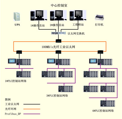 | 1 水厂简介 山东省引黄济青工程棘洪滩水库配套水厂是山东省引黄济青工程管理局青岛分局2004年度“211”重点工程之一,是为进一步促进棘洪滩水库周边城镇经济发展而建设的重点项目。该水厂设计规模为日供水量4万立方,其主要建筑物有:一级泵房、斜管沉淀池(缓建)、V型滤池、清水池、二级泵房及加药加氯间等,水处理工艺较先进。 该水厂自动化监控系统为监控中心与HOLLiAS-PLC构成的集散型工业以太网实时网络控制系统,其中监控中心由一个工程师站、两个操作员站组成,两个操作员站同时又作为一主一从服务器用来存储实时运行数据;PLC系统由三个PLC主控制站、八个子PLC控制站及一个远程I/O站等单元组成,其中,三个PLC主控制站与监控中心之间由光纤环网交换机组成环网,以提高网络可靠性,各控制站与其子站间由PROFIBUS DP现场总线组成现场总线控制系统。水厂自控系统网络图如图1所示。 该水厂设计采用三种控制方式,即监控中心远程控制、现场PLC控制、设备现场手动控制等,其优先级别分别为:现场手动控制最高,其次为现场PLC控制,最低为监控中心远程控制。各自动控制单元实现的功能分别是: