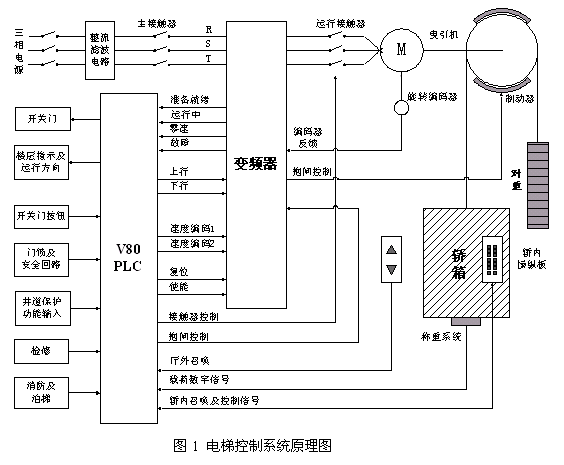 电梯控制系统主要由变频调速主回路、输入输出单元以及PLC单元构成,由如图1所示,用来完成对电梯曳引电机及开关门机的起动,加减速,停止,运行方向,楼层显示,层站召唤,轿箱内操作,安全保护等指令信号进行管理和控制功能。