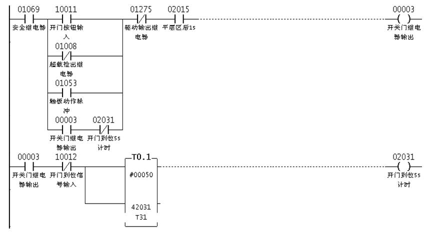 (2)电梯开关门模块: 安全继电器(01069)线圈接通时,有开门信号(10011)或有安全触板动作脉冲输入,在进入平层区1秒(02015)后,驱动门机开门,开门继电器接通;在开门到位信号(10012)或开门到位5秒后,关门继电器输出。