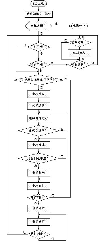 电梯控制系统由呼叫到响应形成一次工作循环,电梯工作过程可分为自检、正常运行、强制运行等三种工作状态,电梯在三种工作状态之间来回切换,构成了完整的电梯工作过程。