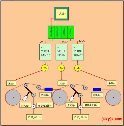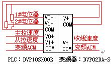(2 )PLC-变频器电气设计。在配置上选用比较有特色的DVP10SX00R的主机,该主机上自带2路模拟量输入和2路模拟量输出,解析度12位。另外选用DVP02DA-S的模块,一路作为两个平衡杆电位器的电源,另外一路作为收线变频器的速度给定。而主机上自带的2路DA,分别作为主拉变频、从拉变频的速度给定。另外2路AD则分别作为2路电位器的反馈输入,参见图4。这样不仅仅能够为客户节省大幅的成本,同时安装尺寸也非常小,节省了安装空间。