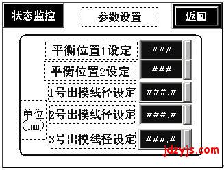 其中K1为主拉与从拉之间的同步比例系数,K2为从拉与收线之间的同步比例系数。 Kf1, Kf2分别为反馈比例系数,ΔE1,ΔE2为偏离平衡位置的偏差,偏差有正负之分。 由于原料丝经过不同孔径的模具后,被拉成细线径的丝。因此伸长率很大,如果对伸长部分不进行处理,在低速和高速的时候,从拉及收线是来不及响应的。如何确定K1与K2的大小,可以通过原料丝与被拉后丝的体积不变的原则来计算。因此在人机界面上由操作者在图3画面进行设定。