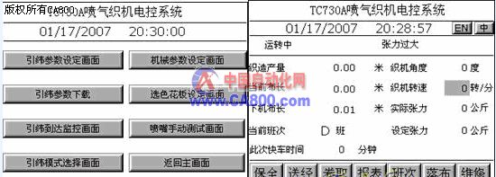 喷气织机的引纬方式是用喷射出的压缩气流对纬纱进行牵引,将纬纱带过梭口,最大特点是车速快、劳动生产率高,适用于平纹和纹路织物、细特高密织物和批量大的织物的生产,是无梭织机中最先进,最为成熟的产品。 ![]() 喷气织机通过张力传感器检测经纱总张力,由 CPU 控制由开口、松经、送经、经轴的卷径变化而发生的经纱张力变化,从而保证送经精度并使经纱保持恒定的张力。并采用电控送经机构,根据织机停台时间由计算机控制伸长,使织轴倒转。 由于喷气织机采用了微机技术以及其他电子技术,对全机的运动进行控制,尤其对产品质量的自动监控,使得喷气织机的生产效率大大提高,产品质量得到保障。织机上还安装了很多监控传感器,使得织机具有自动运行及程序控制的功能。 目前国产喷气织机电控系统都基本上要求具备了以下功能: 1、 电子卷取功能; 2、 电子送经:有单经轴、双经轴两种; 3、 储纬控制:4色自由选纬,主要的储纬方式有FDP和IRO定长型两种; 4、 引纬控制:最多有4个主喷、4个剪切喷或辅助主喷嘴、18个辅喷、1个牵伸喷的高低压控制; 5、 电子多臂:16片电子多臂; 6、 织机的动作控制:正转、反转、快车、停车、正找纬、反找纬、急停、短纬、长纬、断经、绞边、废边断纱检测等的检测; 7、 门幅越来越宽,一般到360毫米,入纬率越来越高,一般到1800米/分钟; 由于国产纺织机械要求电气控制系统,性能高、稳定性好、维修方便、故障率低,最好买回来就能用,用几年也不要保养维修,因为厂家基本没有专业的电气维修工程师;要求能适应高温高湿、多毛羽和粉尘,电源波动大,群机干扰大,连续24小时不间断长期工作,大部分厂条件一般都比较差;总之各种市场很大,要求很严格,但对价格控制更紧。 ![]() 在OMRON喷气织机整体应用方案中(右图为OMRON喷气织机控制系统实物图),角度传感器采用了OMRON公司的E6B2-C型增量型光电编码器,可准确地给出织机任何定位角度,控制精度达1度。此编码器一路给PLC提供角度信号,一路给阀门控制板提供角度信号。 主控部分采用OMRON公司CP1H系列CP1H-XA40DT-D可编程序控制器,该PLC内置功能强大,具体功能及控制对象如下: 内置4轴高速计数功能(单相100kHz,相位差50 kHz),接入旋编信号,在选用360P/R编码器,车速为1200转/分时,高速计数器输入脉冲频率为7.2KHZ,有很大余量。 CP1H内置8点中断输入功能,可捕捉宽度为50uS脉冲,响应频率为5kHz。当使用FDP储纬器时,FDP的FP信号及编码信号采用中断输入,当FDP最高3000转/分时,频率为1.2KHZ,4个FDP用4路中断,完全达到要求。 CP1H内置4路模拟量输入2路模拟量输出功能,最大分别率为1/12000,经纱张力信号通过内置的模拟量输入进PLC。2路模拟量输出可控制两只FDP驱动用的变频器,来调节FDP电机转速,控制纬纱张力。 CP1H还内置了4轴脉冲(100 kHz)的定位功能。电子卷取和电子送经(双经轴)系统最多是3轴伺服电机,配合采用OMRON公司的SMARTSTEP Z系列交流伺服电机可实现位置控制,卷取主动棍定位精度可达0.0001毫米,送经经轴定位精度可达0.0005°,足够满足织造要求。 通过CP1H内置的两个RS232C或RS485通讯口之一的RS485口和触摸屏通讯,适合于显示器和电箱分离式的环境,用一个RS232C口和阀门控制板通讯,满足快速控制的要求。 ![]() 欧姆龙系统方案配置图 送经卷取系统采用OMRON公司的SMARTSTEP Z系列交流伺服电机,具有体积小,节省安装空间;设定方便,设定极其简单;完全自动调整,不会失调等优点。 储纬控制系统采用OMRON公司的3G3MZ变频器,该变频器搭载了自动调整功能的无传感器矢量控制,控制性和应答性有了很大的提高,内置的CE规格的噪音滤波器,不会对别的设备造成影响。外型新颖,接线方便。FDP的转速反馈用中断方式进PLC,根据设定选纬程序和每纬放纱圈数,并和车速连动,通过PID运算后,由PLC的模拟量输出到变频器,调节FDP电机的转速,控制纬纱张力,达到稳定放纱和储纱的要求。 喷气织机的显示器采用OMRON的5.7英寸16级灰度单色屏NT5Z或者NS系列 8英寸彩屏通过其独有的SAP程序库、支持多达1000种配方以及多语言切换功能,与欧姆龙控制器与器件之间进行了简易化的连接和画面制作,大幅度节约了产品开发时间。 ![]() 采用OMRON公司整体解决方案后,优化了喷气织机的工艺结构,使其控制核心更加简单、可靠、稳定,更增加了抗干扰能力,降低了故障率低。 |