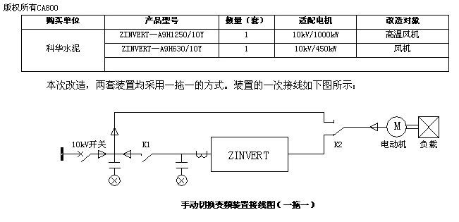 1、用户简介 浙江科华集团是以水泥生产为主,兼房地产开发、新型建筑材料、塑业包装实业和酒店业等集科、工、贸为一体的跨省市跨行业发展的国家大型企业集团,拥有资产12亿元,销售收入15亿元。集团拥有成员企业15家,分布在浙江、江西、重庆 、四川等省市,年水泥生产能力600万吨。 2006年科华集团采用ZINVERT—A6H1250/10Y型高压变频调速系统,分别对浙江分公司一条2500t/d的一条水泥生产线的高温风机(1000kW)进行变频调速节能改造。设备于2006年6月11日开始安装,2006年6月20日正式投入运行。投运以来,节能效果明显,完全满足生产需要。