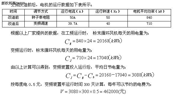 10kV电源经变频装置刀闸K1到高压变频装置,变频装置输出经刀闸K2送至电动机;10kV电源还可经刀闸K2切换至工频侧直接起动电动机。一旦变频装置出现故障,即可马上断开输入侧10kV开关及刀闸K1,将变频装置隔离,切换刀闸K2至工频侧,在工频电源下起动电机运行。刀闸K1、K2之间具有闭锁和防止误操作功能。 变频改造前,用户电机采用转子串水阻软启动及调速,转子串水阻调速也有一定的节能效果,但其电阻上的损耗功率也较大,并且转子的滑环维护工作量与费用都较高。采用变频后取消滑环,电动机转子直接短路,解决了软启动与调速的问题,而且解决了转子串电阻调速的滑环维护量大的问题。 3、改造节能效果  通过以上的计算分析可以看出,采用变频装置对风机进行调速后,与原来采用转子串电阻的调速方式比较,其节能效果是显著的,所产生的经济效益是明显的。 另外由于高压变频的维护工作量大大减小,避免了转子滑环经常需要停机维护、更换影响生产线的生产的问题。