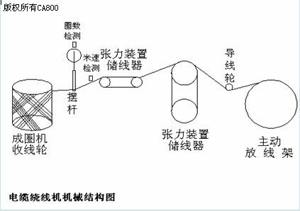 匣式自由放线用成圈机由1000mm主动放线架,张力装置储线器及成圈机组成。线缆从主动放线架放出后,经过张力装置储线器绕到成圈机的膨胀芯轴上去。当达到了设定长度时,成圈机即自动停车。将下托盘降低,并将移动台上的包装纸推到圈线下面,圈线自动落入纸匣中。移动台退出后,下托盘升至工作位置,开始下一圈的绕线。整个流程摆杆保证交叉卷绕位置及形状正确。卷绕及放线张力由储线器张力臂控制恒定,并保证主动放线架同步。如图:
