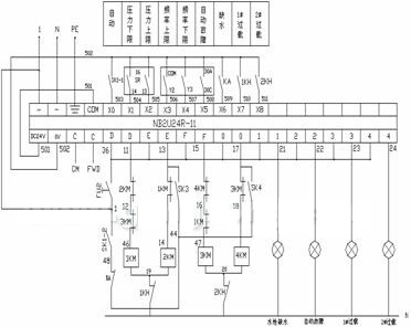 三、 恒压供水控制系统的编程 本程序用富士专用的FLEX PLC编程器编译[1>,利用梯形图清晰直观地展示各设备的运转状况等等。具体编程思想如下: 首先选择利用FLEX PLC的输入继电器、输出继电器以及内部继电器,确定本设计方案所包括的仪器仪表。即一台富士NB系列PLC、两台7.5KW水泵、一台富士G11/P11变频器、一台压力传感器、一台SR90系列PID调节器、若干个空气开关、断路器、中间继电器等。根据PLC接线原理图(如图2所示),进行详细接线,并参考FUJI NB系列可编程控制器得参考手册,对PLC输入输出端子进行定义。 部分梯形图 PLC的恒压供水控制系统部分梯形图如下[2>: