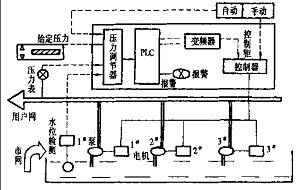 图1 恒压供水系统简图 2全自动恒压供水控制原理 当主水管网压力传感器的压力信号4~20mA送给数字PID控制器,控制器根据压力设定值与实际检测值进行PID运算,并给出信号直接控制变频器的转速以使管网的压力稳定。当用水量不是很大时,一台泵在变频器的控制下稳定运行;当用水量大到变频器全速运行也不能保证管网的压力稳定时,控制器的压力下限信号与变频器的高速信号同时被PLC检测到,PLC自动将原工作在变频状态下的泵,投入到工频运行,以保持压力的连续性,同时将一台备用的泵用变频器起动后投入运行,以加大管网的供水量,保证压力稳定。若两台泵运转仍,则依次将变频工作状态下的泵投入到工频运行,而将另一台备用泵投入变频运行。当用水量减少时,首先表现为变频器已工作在最低速信号有效,这时压力上限信号如仍出现,PLC首先将工频运行的泵停掉,以减少供水量。当上述两个信号仍存在时,PLC再停掉一台工频运行的电机,直到最后一台泵用主频器恒压供水[4>。另外,控制系统设两台泵为一组,每台泵的电机累计运行时间可显示,24小时轮换一次,既保证供水系统有备用泵,又保证系统的泵有相同的运行时间,确保了泵的可靠寿命。 二、系统原理图 1.PLC系统原理图,如图2所示: