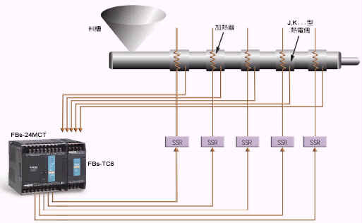 | FBs-PLC提供之热电偶量测模块可直接连接J、K、T...等8种热电偶,而RTD量测模块则可直接接Pt-100及Pt-1000两种RTD sensor。热电偶适合用于温度范围较大,如锅炉等之工业制程应用,而RTD则适用于温度较低,范围较小而分辨率要求较高,诸如冷空调等民生应用。利用温度变化之迟缓特性,而采用多任务扫描量测及多回路温度PID控制,使FBs-PLC单机即能达到32回路之PID温度控制,将整体之效益/成本比发挥至极致,配合温度量测与温度PID控制专用之便利指令,大幅降低程序难度及程序发展与试之人力成本与时间. |