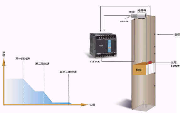 | 增量式Encoder可得知梯箱之楼层及位置而作多段减速,并利用光电Sensor与挡板检知梯箱停止信号,以高速中断启动立即输出(Immediate output)使梯箱准确停止。 |