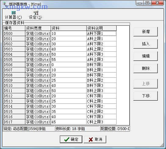 【控制程序】首先将各种原料加入的下限、上限时间设定在缓存器表格中,如下图: