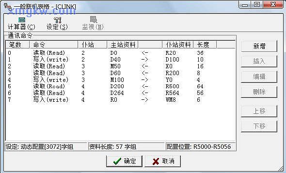 - (2)从上图状态栏可看出,编辑此 8条通讯命令共占用了 57个缓存器R5000~R5056;