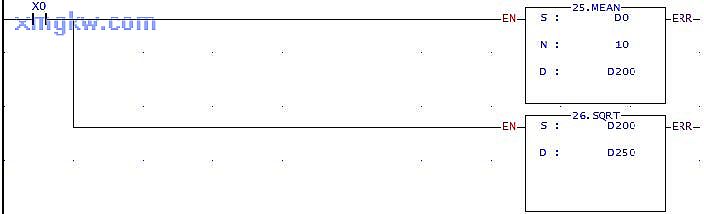 1.当 X0 =ON时,将 D0~D9等10笔历史数据平均值存于 D200,D200开平方后存于 D250。