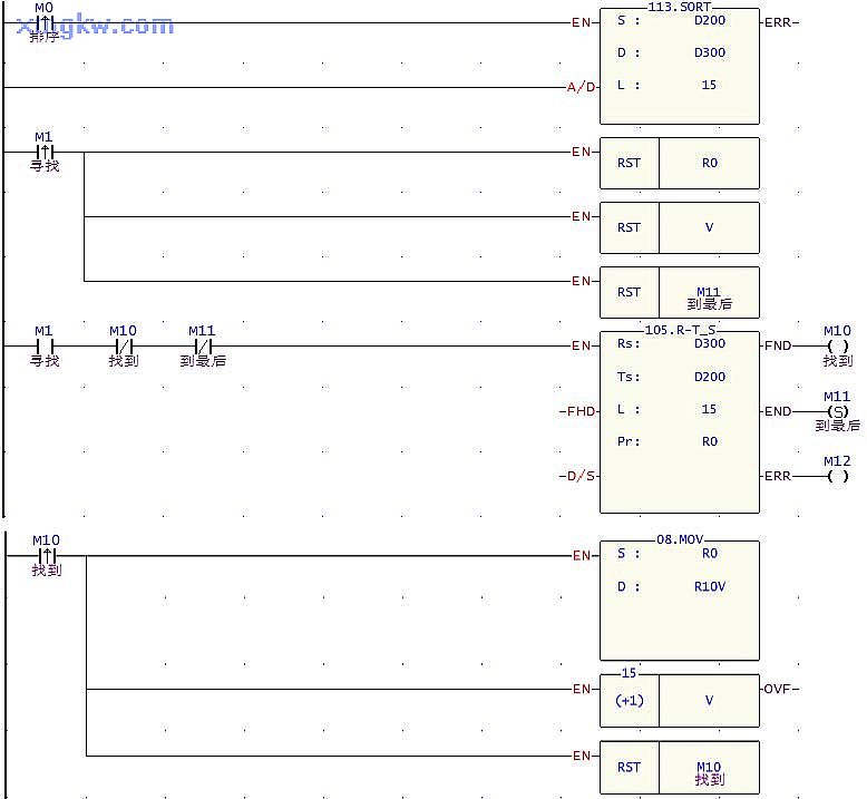 2.按下“寻找序号按钮” M1,即将最小值的原序号找出来,依次存放到 R10~R24。 【元件说明】