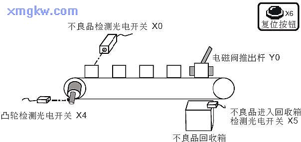 【控制要求】产品被传送至传送带上作检测,当光电开关检测到有不良品时(高度偏高),在第 5个定点将不良品通过电磁阀排出,排出到回收箱后电磁阀自动复位。当在传送带上的不良品记忆错乱时,可按下复位按钮将记忆数据清零,系统重新开始该检测。
