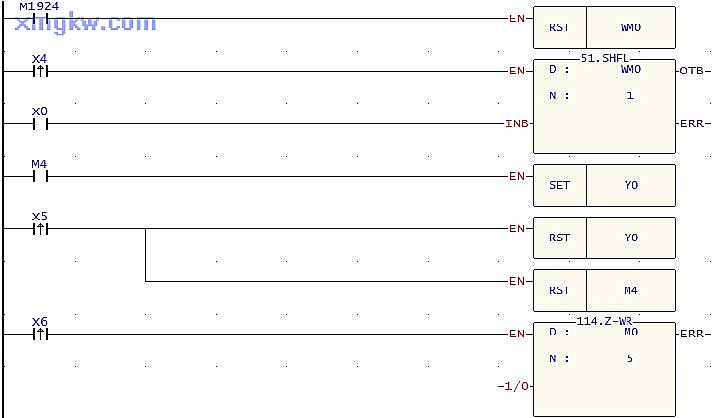 2. 当凸轮每转一圈,产品从一个定点移到另外一个定点, X4 由 OFF→ON变化一次, FUN51指令被执行一次,M0~M4的内容左移一位, X0的状态被传送到 M0。