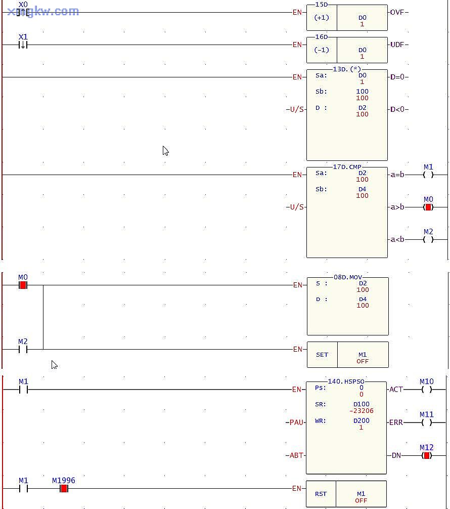 2. D0和 D4初始值为 0,按下寸动左移开关, D0变为 1,其结果乘上 100转换成脉冲数存放到 D2,此时,D2的值与 D4的不等, D2的值( 100)会被传送到 D4,作为绝对定位的目标位置值,同时 M1 被置位为 ON,Fun.140指令被执行。