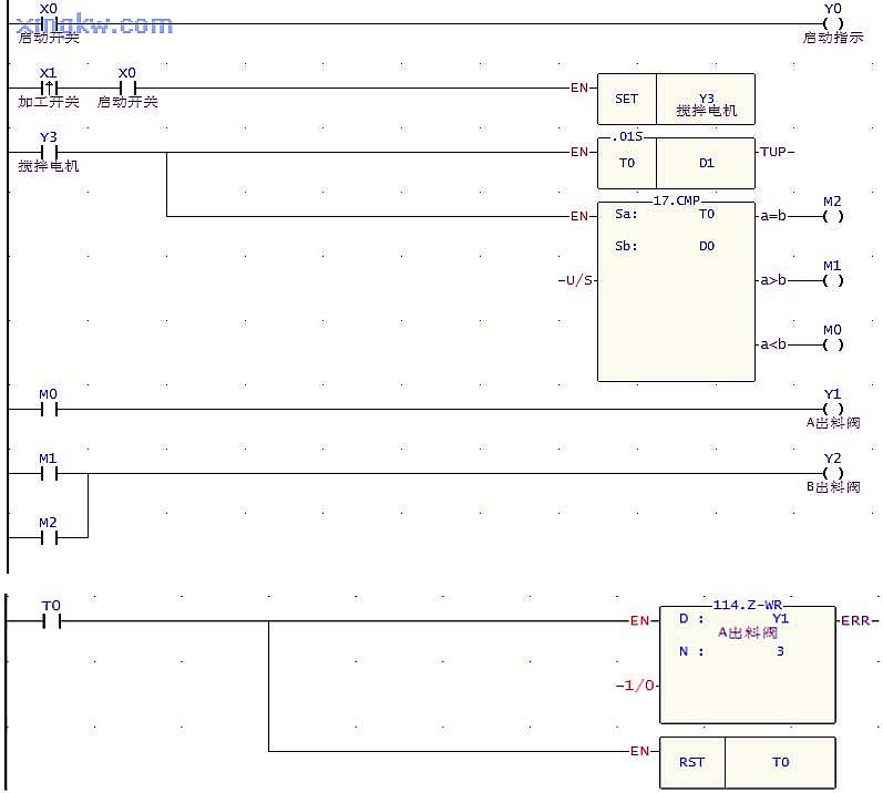 【控制要求】有一原料掺混机及 A、B料,当系统启动( X0)时,系统启动指示灯( Y0)亮,当按下加工启动开关( X1)后,A料控制阀( Y1)开始送料,且搅拌器电机( Y3)开始转动,到达设置时间( D0)后,换由 B料控制阀(Y2)开始送料,且搅拌器电机( Y3)持续转动,直到工作时间( D1)到达。