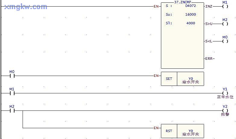 【控制要求】大型公用水塔利用模拟式液位高度测量仪 (0~10V电压输出 )测量水位高度,以便对水位进行控制。当检测水位处于正常高度时,水位正常指示灯亮;当检测水塔只剩余 1/4水量时,开始给水;当检测水位到达上限时,报警并停止给水。