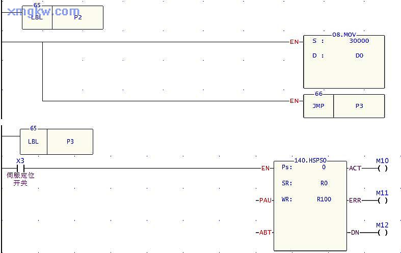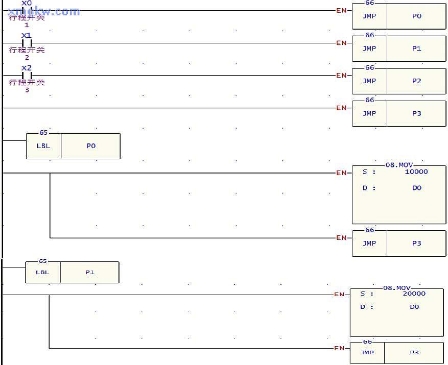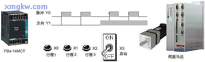 【控制要求】永宏FBs -14MCT发送脉冲控制伺服电机,有 3种工作行程距离,可通过三个开关任意选择,满足不同的工作需要。