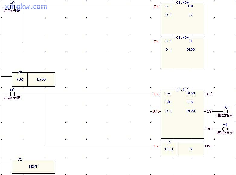 - 当相加结果数值小于 -32768时,BR接通,输出线圈Y1导通,借位指示灯亮;当相加结果数值大于 32767时,CY接通,输出线圈 Y0导通,进位指示灯亮。