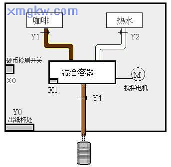 【控制要求】投入一枚硬币后,出纸杯处弹出一个纸杯,同时出咖啡, 2秒钟后出热水,注入到一定量热水后,搅拌电机运行, 30秒后从咖啡流出口流出冲调好的咖啡。
