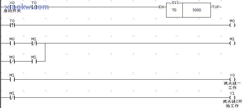 【控制要求】 PLC产品生产线中,一个作业员需同时负责将两条传送带上的产品放入到包装箱里。将一条传送带运行 30秒后,该条流水线停止传送,另外一条流水线开始运行 30秒。如此,两条传送带交替运行,保证作业员有足够时间去将产品放入包装箱。