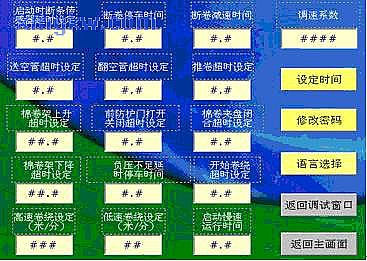 根据画面显示信息量采用十八个画面,各画面之间通过触摸键进行切换,同时触摸屏上各类组件的内存单元和与PLC中数据存储区的的单元相关联,构成系统整体监控。根据设备工艺要求设计了参数设定、系统调试、故障信息查询参数设定等画面。