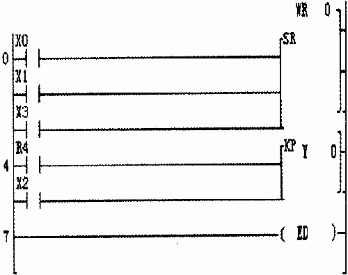 ![]() 图7 编程元件示例程序 图7所示程序中,WR0即为字元件,是左移位指令SR的编程元件,而Y0为输出软继电器的线圈,X0、X1、X2、X3则为输人软继电器的触点,其中第4步的R4触点为位元件R4的常开触点,而位元件R4又是字元件WR0中的一位,因此其状态受限于WR0的移位结果。